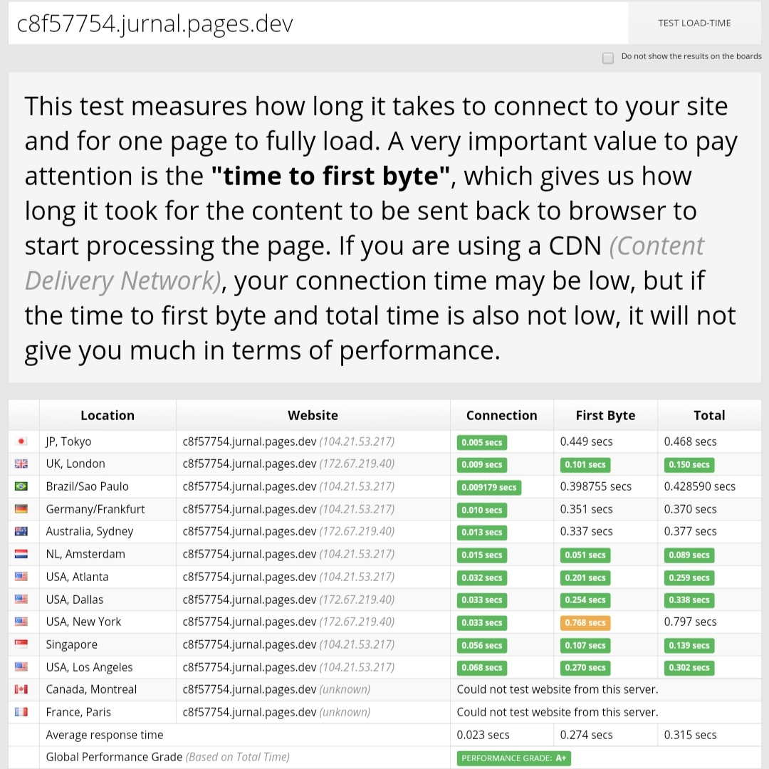 Ini yang paling menarik perbandingan performa antara vercel, netlify dan cloudflare, bisa dilihat cloudflare pages menang dalam hal ini dengan kecepatan loading membutuhkan total waktu 0.315 detik dengan skor A+ hmm menarik.