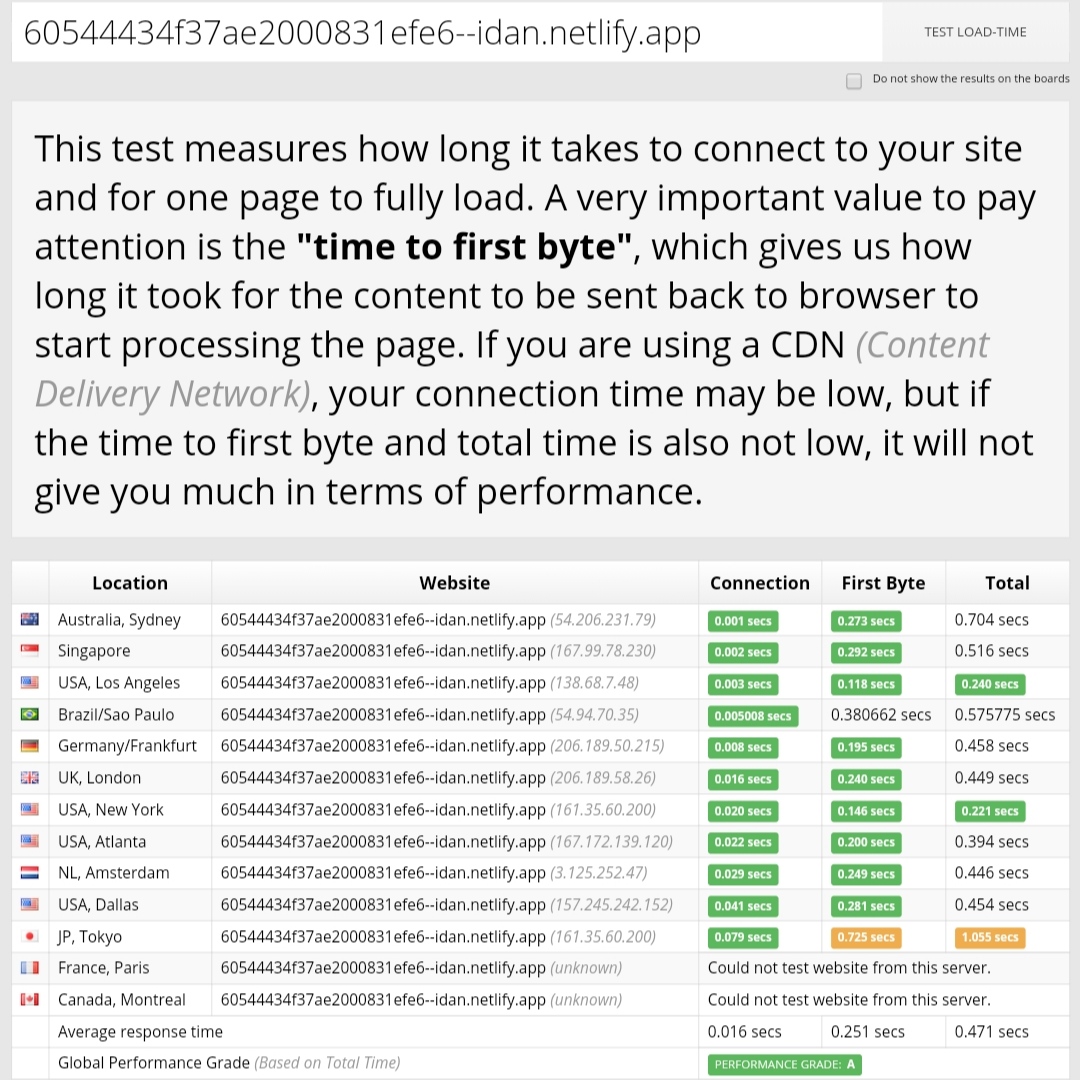 Setelah mendapatkan rekor build time yang cepat ternyata performa dari hosting netlify memuaskan dimana ketika dites di sucuri mendapat skor A dan total kecepatan loading website di angka 0.471 ms