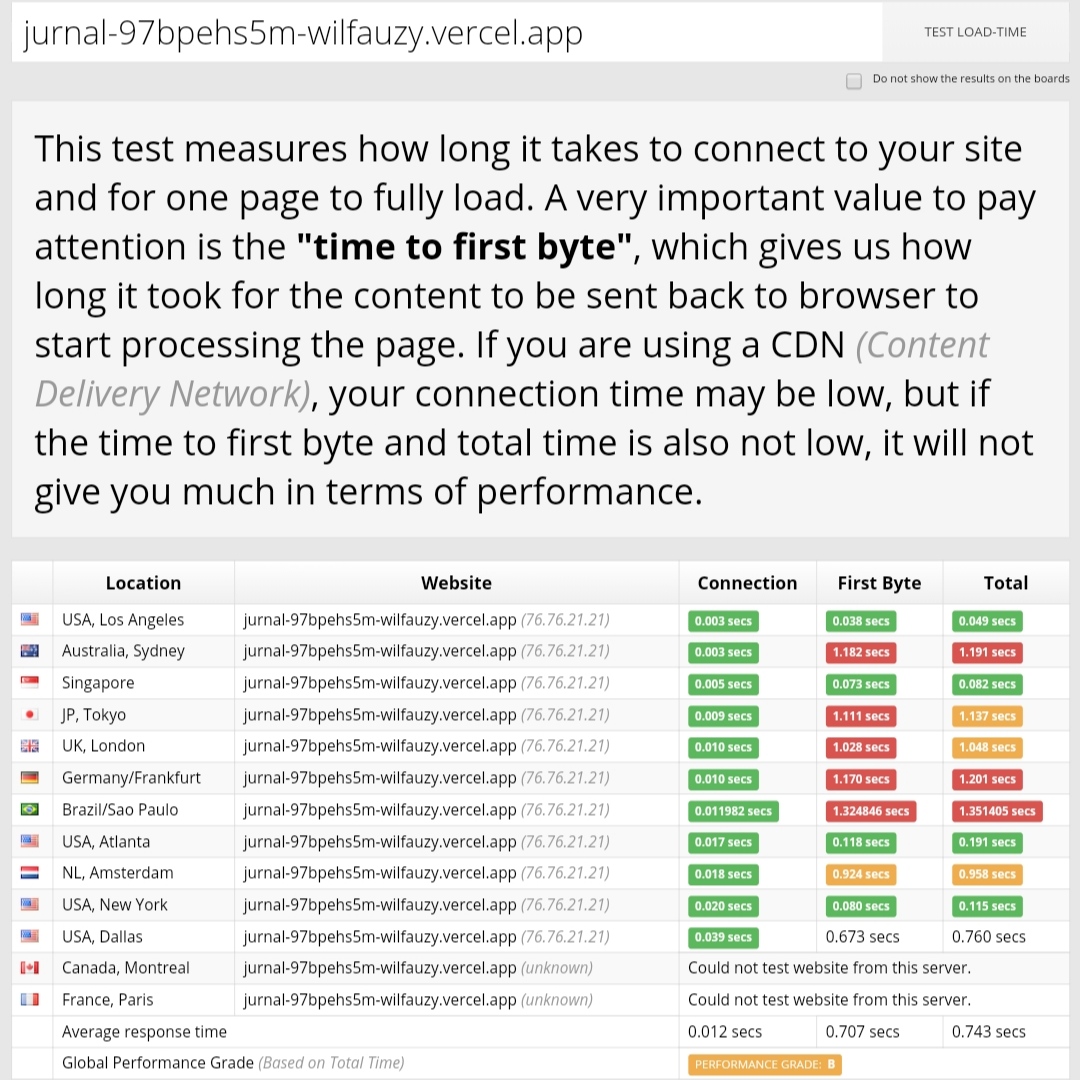 Jika dibandingkan dengan netlify hosting vercel seperti kalah cepat jika dilihat dari perbandingan diatas, disini vercel mendapatkan skor B dengan total waktu loading 0.743 ms.