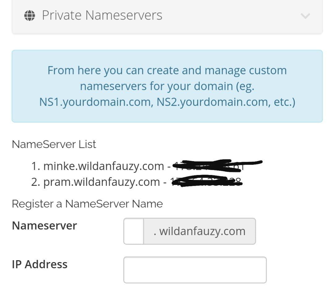 Pertama pastikan layanan register domain memiliki fitur name server, tidak semua register domain menyediakan private nameserver, tanyakan terlebih dahulu ke penyedia layanan.
