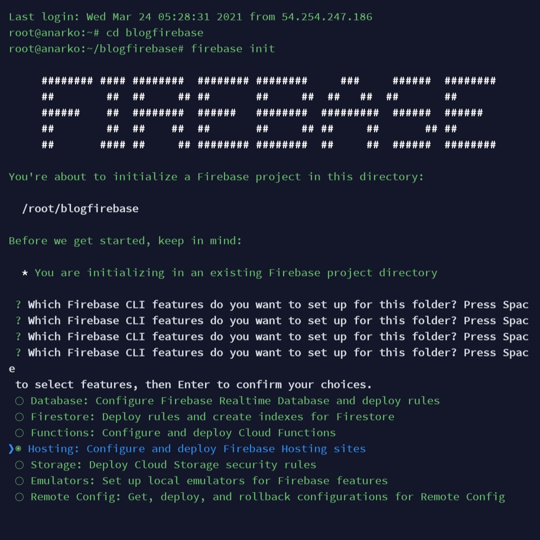 Masuk ke folder source code blog hugo kalian semisal cd my-site, setelah itu lakukan firebaase init, untuk memulai projek di firebase, pilih firebase hosting.