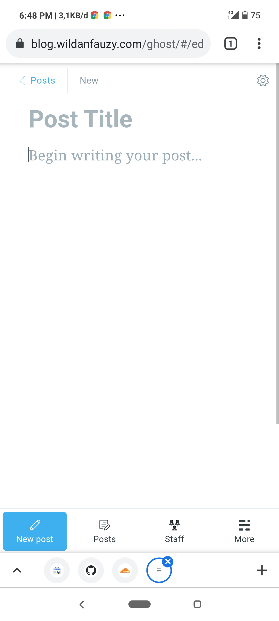 Tampilan mode menulis di ghost, simple smooth dan keren, rasanya Gutenberg milik WordPress keliatan sangat ribet wkwk