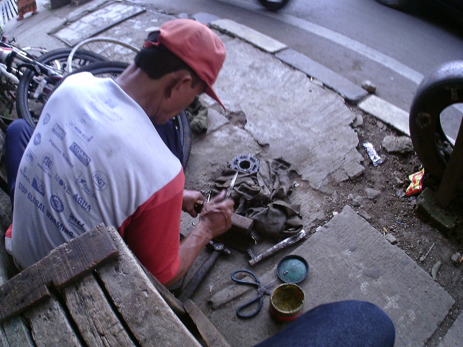 Sambil nunggu sepeda kesayangan gue dirukyah gue nongkrong di bengkel sambil mengamati perbatasan kota bandung yang semakin hari semakin macet dan tentunya sambil menyeruput kopi dan asap putih dalam keadaan santai gue memperhatikan apa yang dilakukan tukang bengkel.